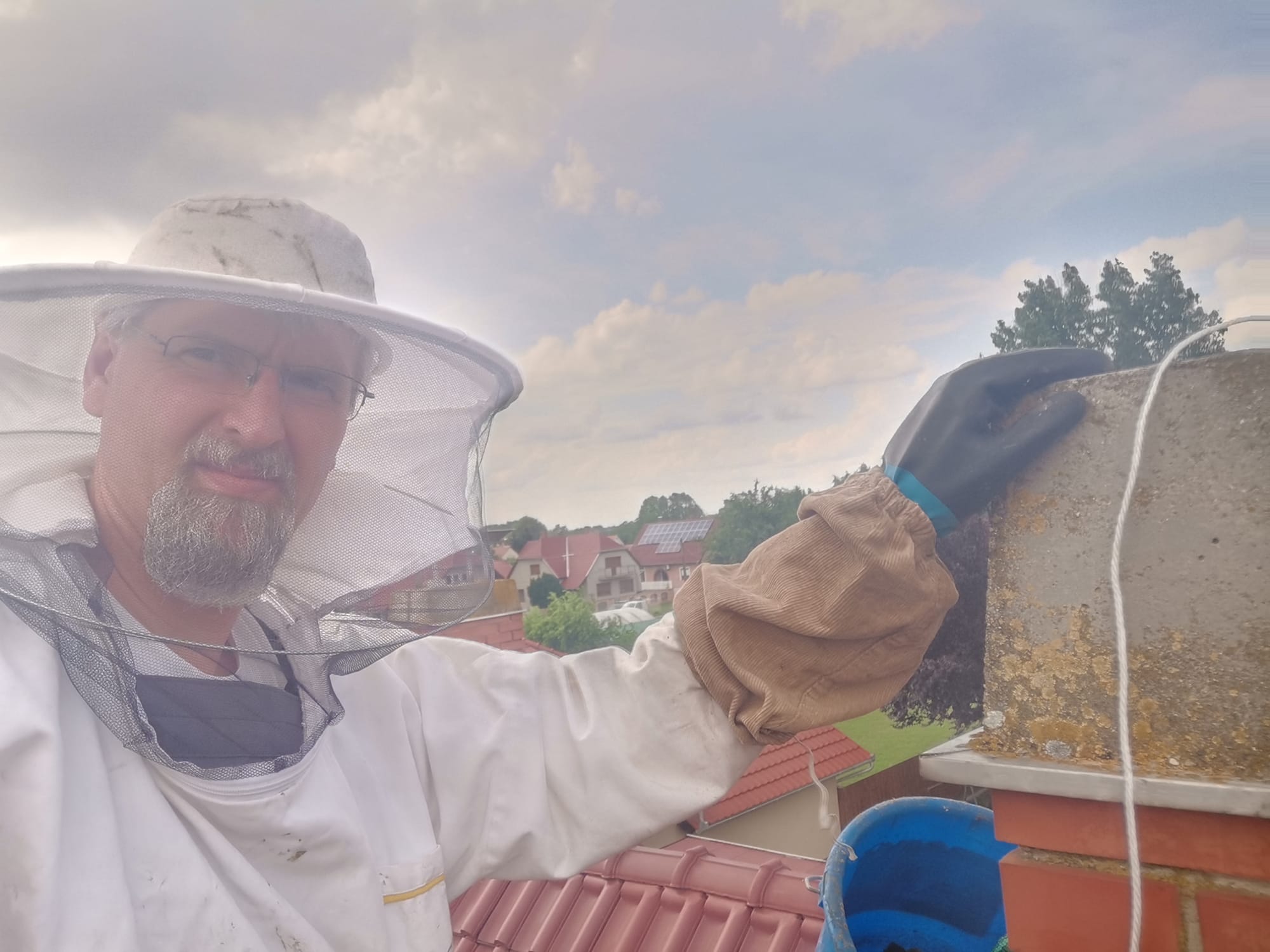 Visszatérve a kérdésre, abban az esetben, ha találunk ilyen méhrajt, akkor azt a méhészek az értesítés után általában be szokták fogni. Erre vannak különféle fogások, de azért a méhészeknek is kihívás lehet, hogy hogyan is oldják meg a feladatot. Gyakran megesik, hogy a raj lóg egy ágon, mely lényegesen egyszerűbb helyzet, aztán olyan is előfordulhat, hogy 5 méter magasan egy fán telepednek meg, ahol a befogásuk már jóval macerásabb folyamat. Jártam már úgy, hogy egy kéményből kellett kiszednem őket a kémény bontása nélkül egy tetőn egyensúlyozva. Ez már elég izgalmasnak számít, melyet nem szívesen élnék át újból. Aztán ugye ilyen esetekben az ember megkeresi a királynőt vagy királynőket, mert ha ez már a második raj (van, hogy többször is megrajzik a család), abban az esetben szűzanyák, párzatlan anyák is találhatóak a rajban.